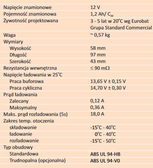 Akumulator Alarmtec serii BP 12V 1,2 Ah – DANE TECHNICZNE: